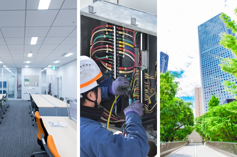 当社は、埼玉県・東京都エリアを中心に、オフィスビル・公共施設・病院など様々な建物の電気設備工事を手掛ける会社です。